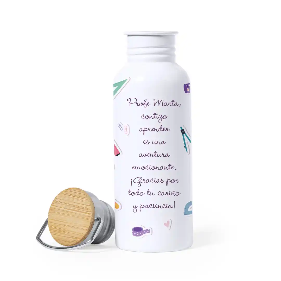 Sorprende a ese profesor especial con una botella personalizada con su nombre. Práctica, elegante y llena de amor. Elige entre estos dos modelos según el nivel de personalización que quieras realizar.