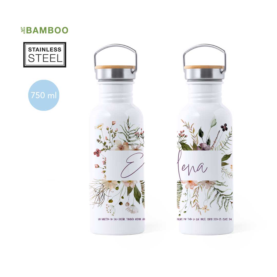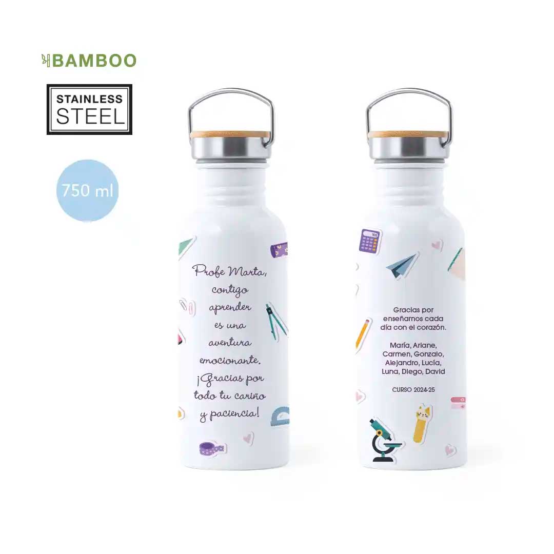 Fabricada en acero inoxidable, esta botella de 700 ml no solo es duradera, sino también increíblemente atractiva gracias a su diseño retro y acabados premium. Personalízala con el nombre del profesor, con una frase especial y el nombre de los alumnos de la clase y haz que este regalo se convierta en un recuerdo inolvidable.