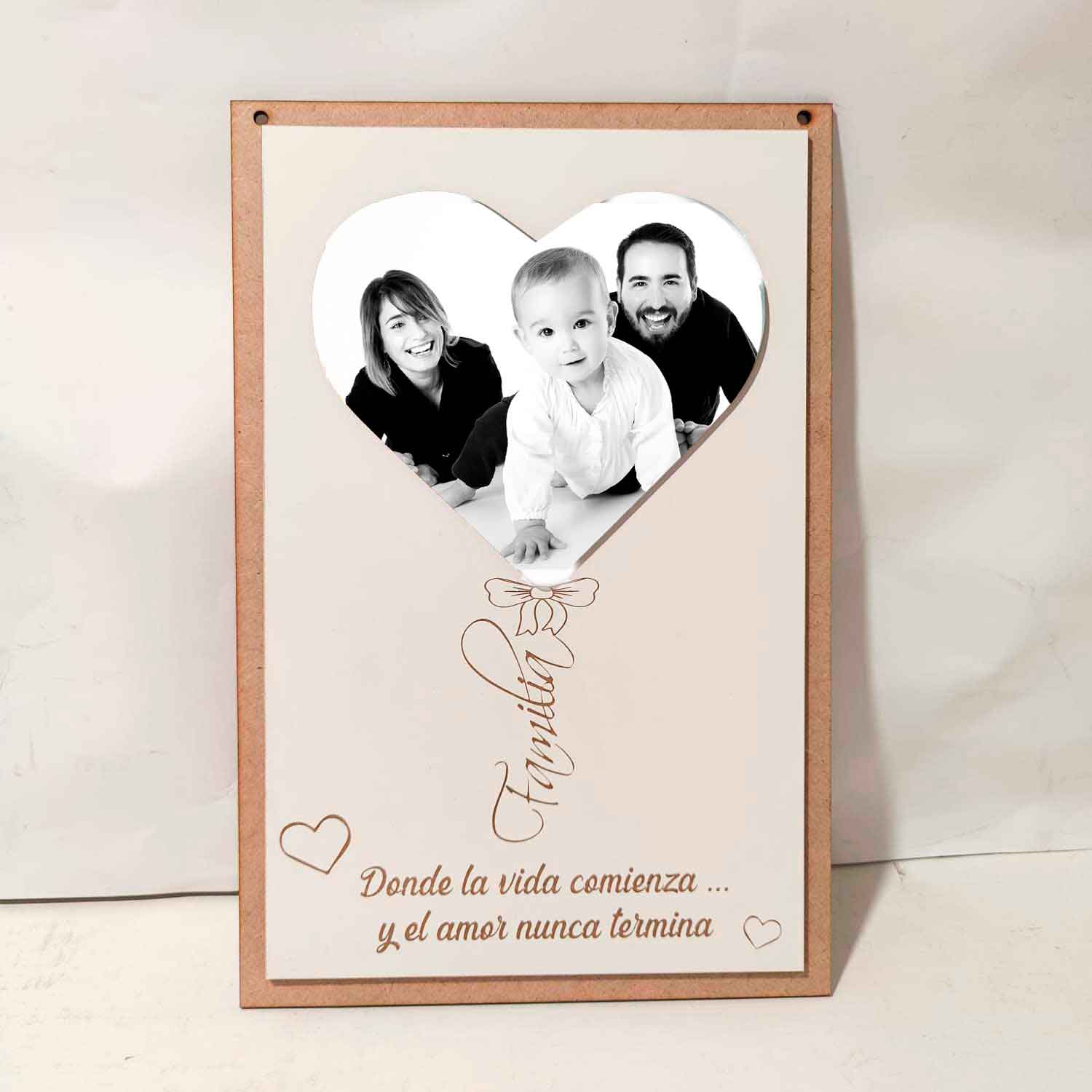 Este cuadro único presenta una combinación perfecta de tecnología y artesanía: una foto en forma de corazón impresa sobre la superficie de madera y una frase que elijas, grabada con precisión láser.